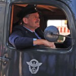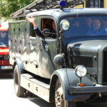 Fröhlich winkt hier der frühere Vereinsvorstand Franz Glasl aus dem eigens organisierten, antiken Feuerwehrauto, das an die langjährige Geschichte der Wehr – die so veränderten Zeiten und Anforderungen – bestens erinnerte gleich am Festzug-Beginn heute.