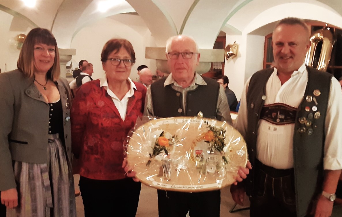 Die 2. Schützenmeisterin Doris Vucina und Ludwig Bürger überreichten Max Albersinger und seiner Frau Annemarie ein Geschenk und wünschten ihm weiterhin Gesundheit und Freude am Schießsport. Das Foto zeigt beim Fest von links Doris Vucina, Annemarie Albersinger sowie Jubilar Max Albersinger und Ludwig Bürger.