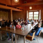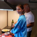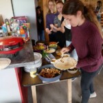 Gegen Mittag starteten endlich die Vorbereitungen auf das Essen. Es wurden Klein-Gruppen gebildet, die sich ums Kleinschnibbeln und Anbraten des Gemüses sowie um die Zubereitung der Dips kümmerten. Nachdem ein Büffet aufgebaut und die Tortillas im Ofen erwärmt worden sind, konnte sich jeder seinen individuellen Wrap selbst zusammenstellen – sei es vegetarisch u.a. mit den geschmacksintensiven Tomaten aus Jürgens Garten oder proteinreich mit angebratenem, zartem Hähnchenfleisch.