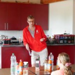 Auch in den von der Werbung als so gesund angepriesenen Obst-Smoothies steckt mit über 13 Gramm auf 100ml so einiges an Zucker – auf fast neun Stück Würfelzucker kommt man hier bei nur einem Getränk. „Wie viel Stück Würfelzucker enthält ein Glas Cola, wie viel ein Glas Saft pur?“ wurden die Kinder nun gefragt. Es folgten Schätzungen zwischen 8 bis 20 Stück (Glas Cola) und zwischen 5 bis 12 beim Saft (beides 0,4l). Die Auflösung verriet – mit 11 Stück Würfelzucker enthielt das Glas (Apfel-)Saft sogar ein Stück mehr als das Glas Cola. Das Erstaunen war den Teilnehmern in ihren Augen deutlich anzusehen. Wer hätte das vorher gedacht? „Darum lieber auf Schorlen oder gleich auf Wasser zurückgreifen“ lautete Marinus‘ Tipp an die Gruppe.