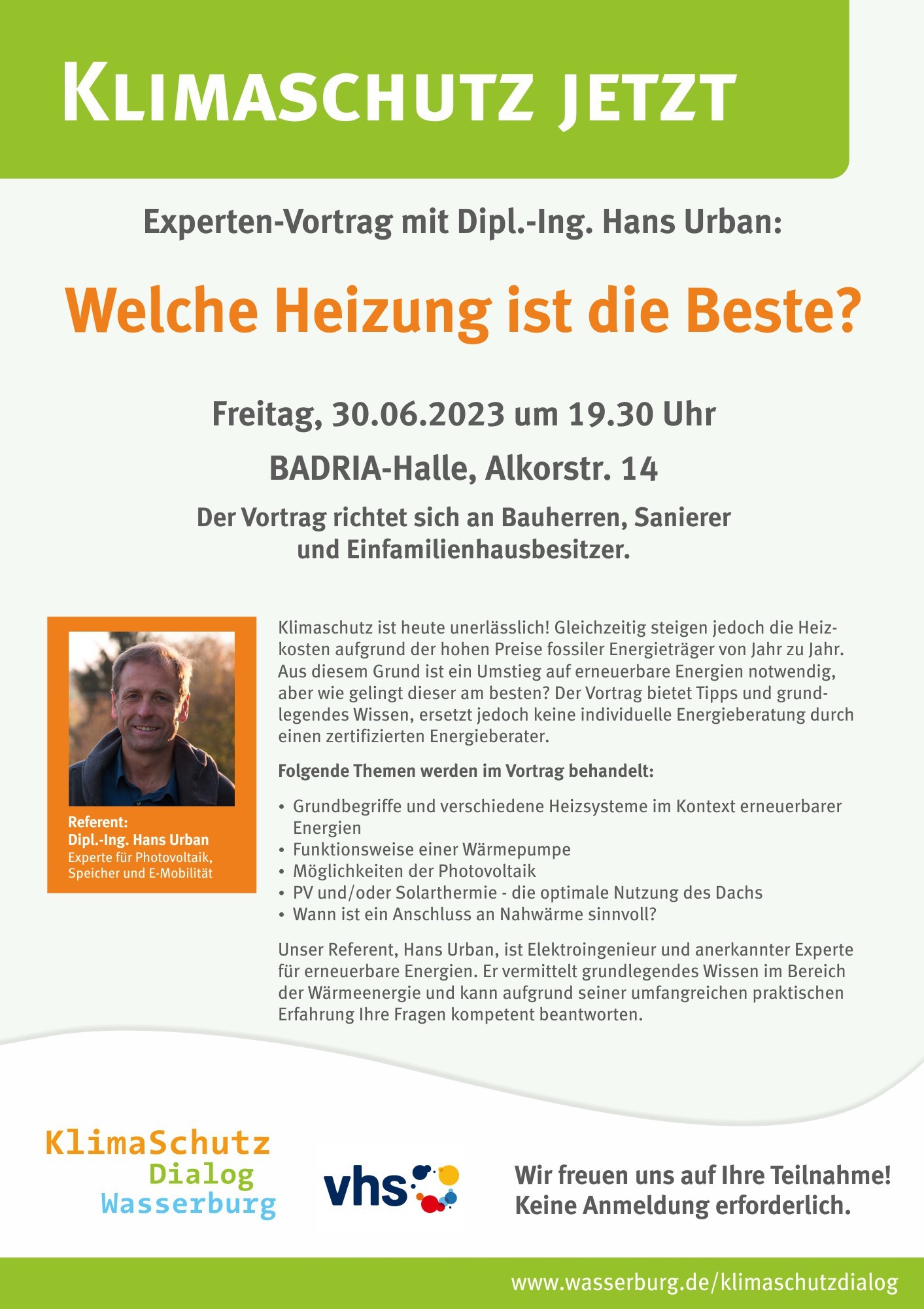 Im Rahmen des Klima-Schutz-Dialogs und in Zusammenarbeit mit der Stadt Wasserburg sowie der VHS Wasserburg wird zu einem Vortrag zum Thema „Welche Heizung ist die Beste? Weg von Gas und Öl, aber wie?“ eingeladen.
