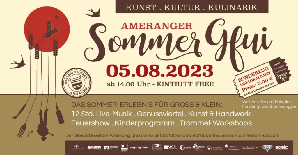 Zum inzwischen dritten Mal veranstaltet der Gewerbeverein Amerang am Samstag, 5. August, das „Ameranger Sommer Gfui“, ein Kunst-Kultur-Kulinarik-Event der besonderen