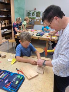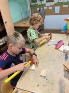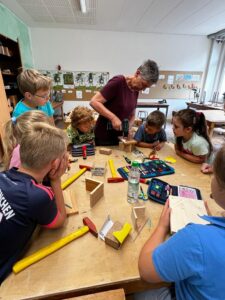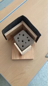 Es wurde genagelt, geschraubt und geschliffen und aus Ton ein Würfel geformt. Darin wurden dann mit unterschiedlich dicken Stäbchen vorsichtig Nistlöcher für Wildinsekten gemacht.