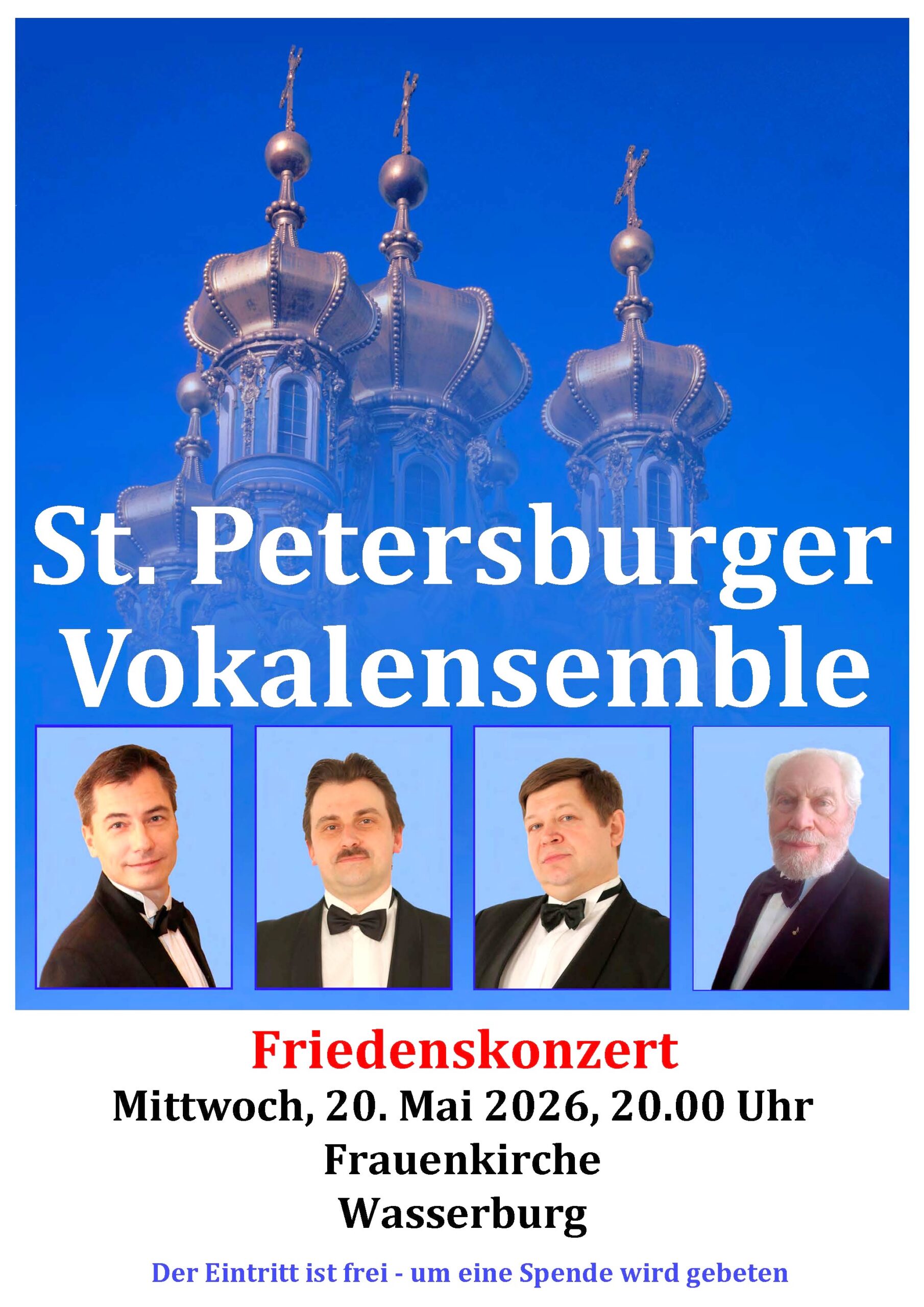 Dieses Konzert in Wasserburg steht im Zeichen des Friedens und soll als musikalische Brücke zwischen Kulturen dienen. In der besonderen Atmosphäre der Frauenkirche werden die Sänger des „St. Petersburger Vokalensembles“ Werke präsentieren, die die universelle Sprache der Musik als Mittel zur Verständigung und Versöhnung hervorheben – als kraftvolle Botschaft der Musik.
