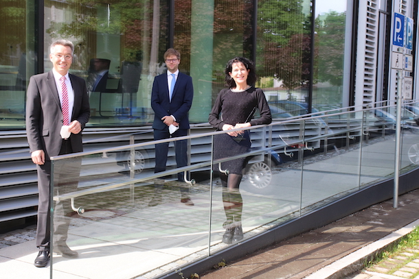 Foto: Beim Barrierefreien Bauen sollen Behörden Vorbild sein. Landrat Otto Lederer, Abteilungsleiter Quirin Zallinger und die Präsidentin der Bayerischen Architektenkammer Christine Degenhart an der Rampe, die zum Haupteingang des Rosenheimer Landratsamtes führt.