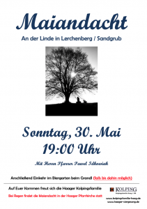 Eine Maiandacht unter freiem Himmel veranstaltet die Haager Kolpingsfamilie am kommenden Sonntag, 30. Mai, um 19 Uhr an der Linde in Sandgrub bei Lerchenberg. Nachdem Gottesdienste im Freien nun wieder stattfinden dürfen, freut sich die Kolpingfamilie auf einen schönen Frühlingsabend mit musikalischer Umrahmung im Gedenken an die Gottesmutter Maria, die auch besonders als die Schutzpatronion des Bayernlandes verehrt wird. Im Anschluss an die Maiandacht lädt Matthias Bachmeier – unter Einhaltung der geltenden Vorschriften – zur Einkehr in seinen neugestalteten Biergarten ins Hofcafè ein. Bei schlechtem Wetter findet die Maiandacht in der Pfarrkirche statt.