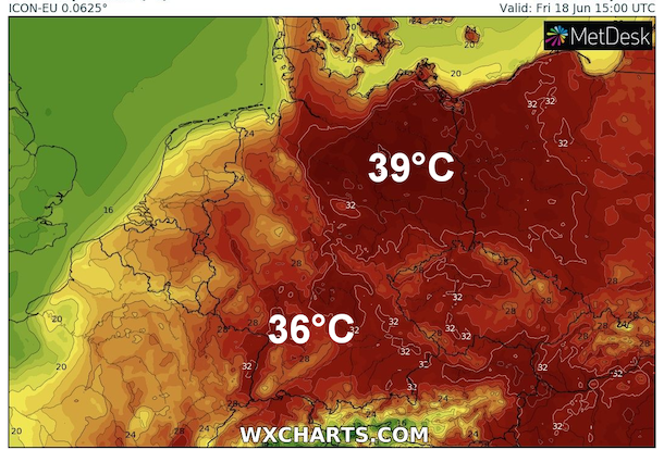 Freitag: 28 bis 39 Grad, nach Osten besonders heiß, auch sonst sehr warm und schwül, Gewitterluft!