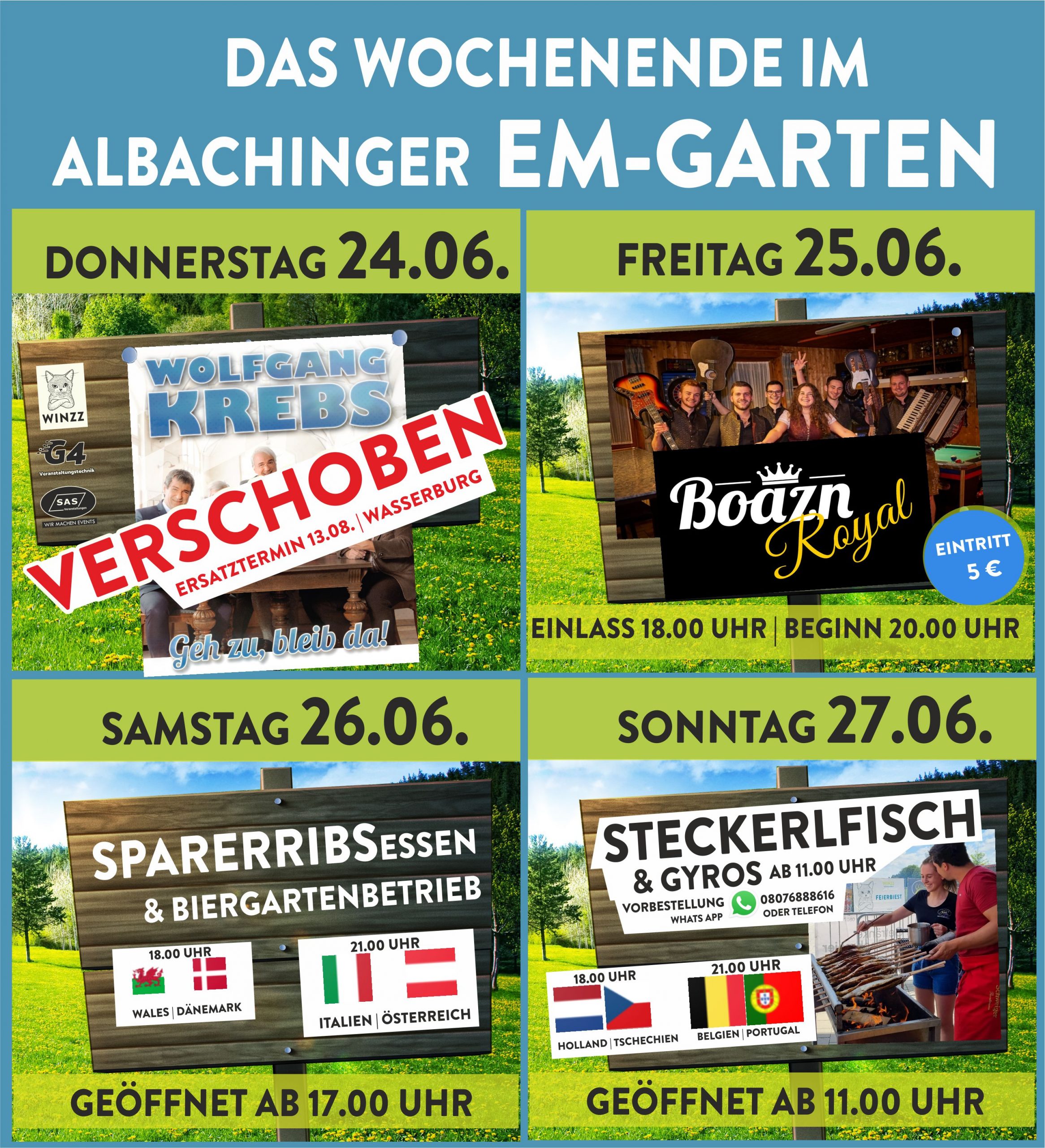 Samstag: Sparerribsessen, Biergartenbetrieb bei bestem Sommerwetter und Übertragung der Achtel-Finalspiele: 21 Uhr, Italien gegen Österreich. Tischreservierungen gerne per Whatsapp oder Telefon unter 08076/888616