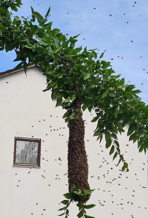 Ein sonderbares Rauschen und Brausen erfüllt die Luft. Ein Bienenschwarm hat sich in einer jungen Buche auf einem Anwesen im Burgerfeld lautstark niedergelassen. Claus Steger, bekannt als Vorstand der Wasserburger Imker, nimmt sich der Sache an: „Für meine Mädels bin ich immer da.“ Steger ist mit einer Schwarmfangkiste zur Stelle. „Etwa 15.000 Bienen“, schätzt er, „werden es sein.“