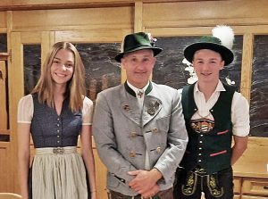 Das Foto zeigt zwei von ihnen mit Vorstand Hubert Mittermeier – Verena Eder und Thomas Bacher, die beide seit Kindesbeinen im Verein tanzen und platteln.