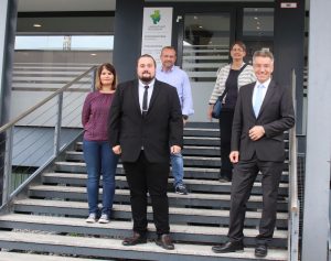 Vor dem Eingang des neuen Verkehrszentrum Rosenheim (von links) Sachgebietsleiterin Verkehrswesen Claudia Conrads, Gruppenleiter Kraftfahrzeugzulassung Christian Ager, Gruppenleiter Fahrerlaubnisbehörde Bianco Domprobst, Abteilungsleiterin Bettina Bauer und Landrat Otto Lederer.