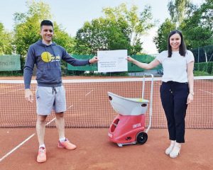 Gerne überreichte Kathrin Rechl, Leiterin der Sparkassen-Geschäftsstelle Rott am Inn einen symbolischen Spendenscheck in Höhe von 500 Euro für die Anschaffung einer solchen Maschine an Janosch Müller, Vorstand der Abteilung Tennis im ASV Rott.