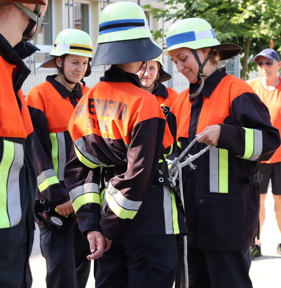 An vielen Abenden wurden die Abläufe und Handgriffe geschult und automatisiert, geduldig angeleitet insbesondere von Werner Nowak und Rainer Größl, unterstützt von einem ganzen Team an erfahrenen Feuerwehrlern. Immer wieder wurde an den Abläufen gefeilt, denn bestimmte Aufgaben mussten in einer vorgegebenen Zeit erfüllt werden. Das bedeutete, dass viel und schnell gerannt werden musste. Gerade in der letzten heißen Sommerwoche war das Training somit nicht immer ein Vergnügen. Umso mehr freute sich die Gruppe, dass sie hier von Mitgliedern der Jugendfeuerwehr unterstützt wurden, die geduldig nach jedem Übungsdurchgang Schläuche entwässerten und wieder perfekt aufrollten.