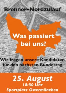 Veranstaltet wird am Mittwoch, 25. August, um 18.30 Uhr ein Diskussionsabend zum Thema Brenner-Nordzulauf am Sportplatz des SV Ostermünchen in Berg 18 bei Ostermünchen.