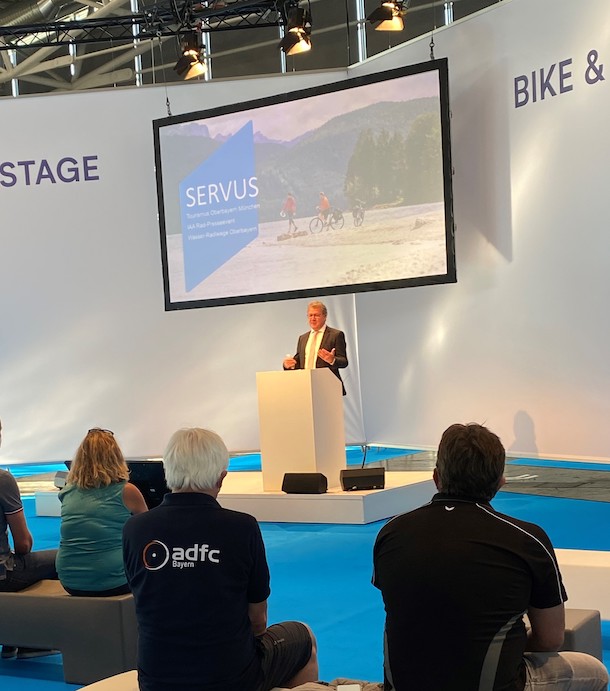 „Viele Wege führen nach Rom und drei schöne oberbayerische Wege rund um München führen hier zu dieser Messe“, so Klaus Stöttner bei der Begrüßung der Radfahrer, die auf drei verschiedenen Routen entlang der Wasser-Radlwege Oberbayern aus Fürstenfeldbruck, Holzkirchen oder Freising zur IAA Mobility gefahren waren und auf dem Weg verschiedene Aspekte des Radtourismus thematisierten. Für Klaus Stöttner ist das Radfahren eine der zukunftsträchtigsten Sportarten. Zugleich betonte er, dass die Wasser-Radlwege Oberbayern mit ihrer Anbindung an etliche Bahnhöfe eine klimafreundliche Art des Reisens und große Flexibilität bei der Routenplanung ermöglichen. Auch Clemens Baumgärtner, der Referent für Arbeit und Wirtschaft der Landeshauptstadt München, ging auf die zunehmende Relevanz des Radsports ein: „Die Mobilitätsbranche ist zweifelsohne eine Leitindustrie hier in Oberbayern und dazu gehört natürlich auch die Fahrradindustrie.“ Mehr als 1.400 Kilometer Radwege gibt es bereits in und um München, und das Netz soll laut Baumgärtner in den kommenden Jahren noch weiter ausgebaut werden.