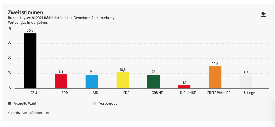 In der Gemeinde Rechtmehring heißt der Sieger im Kampf um das Bundestagsmandat Stephan Mayer. Mit 44,7 Prozent ließ der CSU-Kandidat seine Verfolger hinter sich. Bei den Zweitstimmen erzielt die CSU 36,8 Prozent. Zweitstärkste Kraft sind in Rechtmehring die Freien Wähöer mit 12,5 (Erststimme) und 14,5 Prozent bei den Zweitstimmen. Die Wahlbeteiligung lag bei 85,4 Prozent.