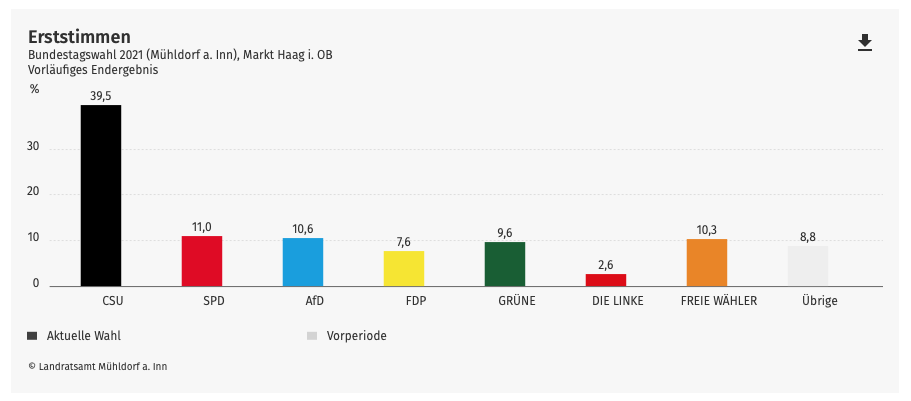 Stephan Mayer ist auch in Haag der klares Sieger bei der Bundestagswahl. Mit 39,5 Prozent ließ der CSU-Bundestagskandidat seine Verfolger weit hinter sich. Bei den Zweitstimmen erzielt die CSU 31,7 Prozent. Zweitstärkste Kraft ist in Haag die SPD mit 11,0 Prozent (Erststimme) und 14,2 Prozent (Zweitstimme). Die Freien Wähler holen Platz drei bei den Erststimmen (10,3) und zusammen mit der FDP bei den Zweitstimmen (11,3).