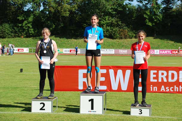 Was Lea Mader in der letzten Woche bei den Oberbayerischen Block in Emmering mit einer Weite von 18,14m im Diskuswurf vielversprechend begann, sollte sie in Aschheim noch toppen. Zur großen Freude ihrer Trainer packte sie noch über vier Meter auf ihre bisherige Bestmarke drauf und eroberte mit 22,25m völlig überraschend die Bronzemedaille bei den Mädchen W13 hinter der Siegerin Johanna Anglhuber (24,45m/TSV Winhöring) und Lili Metschl (23,39m/LG Stadtwerke München). Ein riesen Erfolg für die sympathische Zwölfjährige aus Edling, die sich sichtlich über ihre erste wichtige Medaille freuen konnte. Vor ihrem ersten Versuch wagte sie in Absprache mit Trainer Marinus die Technik-Umstellung vom Standwurf auf die 5/4-Drehung, nachdem die Testwürfe vor Wettkampfbeginn sehr vielversprechend ausfielen. Diese Maßnahme sollte sich auszahlen. Nun gilt es die guten Technik-Ansätze weiter zu verbessern, sodass Lea zum kommenden Frühjahr mit sicherem Stand aus der (vollen) 6/4-Drehung die Scheibe noch weiter hinausschleudern kann.