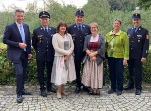 Das Foto zeigt (von links) Landrat Otto Lederer, Kreisbrandmeister Hermann Kratz und Ehefrau Marlies Kratz, Kreisbrandinspektor Franz Hochhäuser und Ehefrau Christine Hochhäuser, Bettina Bauer Leiterin der Abteilung Öffentliche Sicherheit und Ordnung, Ausländerrecht, Verkehrswesen im Landratsamt Rosenheim sowie Kreisbrandrat Richard Schrank.