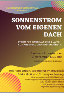 Bitte vormerken und sich anmelden: Die Gemeinde Babensham lädt ihre Bürger ein zum kostenlosen Vortrag im Gasthaus Brunnlechner am Dienstag, 9. November, um 19.30 Uhr. Das Thema: Sonnenstrom vom eigenen Dach – Strom für Haushalt und E-Auto klimaneutral und kostengünstig!