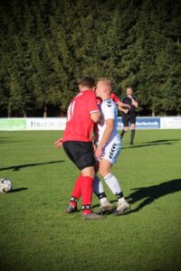Bis zur Halbzeit neutralisierten sich beide Mannschaften großteils, man schenkte sich nichts – siehe Foto unten Benjamin Schneid (rotes Dress) auf ‚Tuchfühlung‘ – und ohne nennenswerte Chancen ging es in die Halbzeitpause.