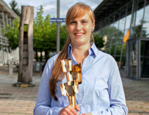 Foto: Natalie Stut ist eine von 32 Absolvent*innen staatlicher, bayerischer Hochschulen und Universitäten, die mit der Bronzestatue „Gedankenblitz“ geehrt worden sind.