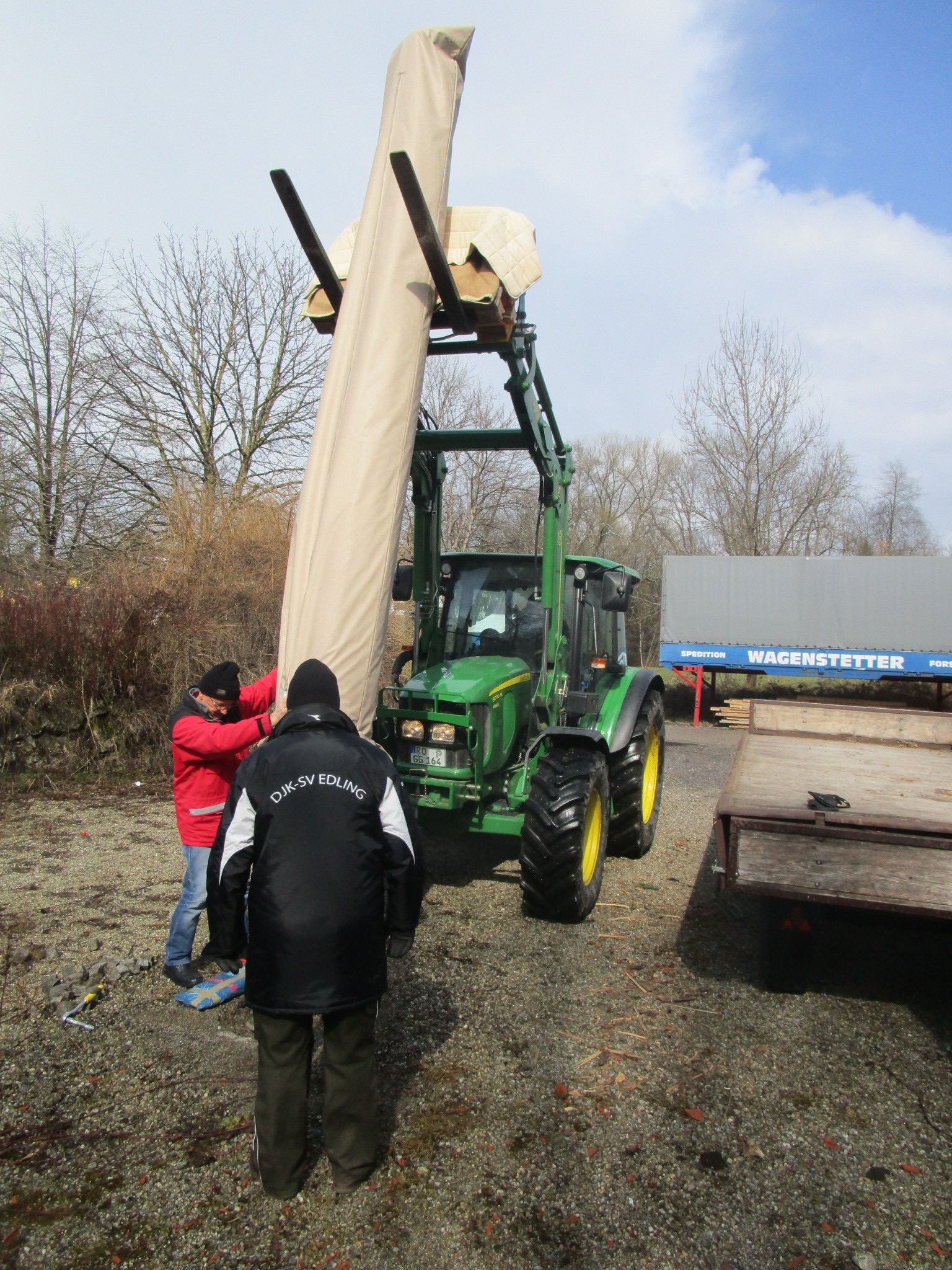 Gerhard Glas lieferte dann in seiner Freizeit den von der Firma Adler spendierten Beton, in welchem die von Gerhard Scheibner erstellte Grundverankerung befestigt wurde. Dann ging es ans Aufstellen. Mit Hilfe von Georg Glas – Traktor – und den Helfern Martin Jansen und Gerhard Scheibner hievten die Boccia-Verantwortlichen den großen Sonnenschirm auf das neue Fundament auf der Boccia-Anlage.