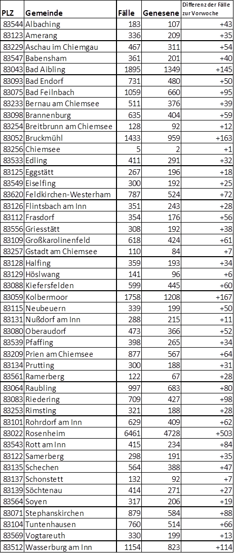 Dem Gesundheitsamt Rosenheim wurden täglich durchschnittlich etwa 414 neue Fälle (insgesamt 2.896 Neumeldungen, Vorwoche: 1.921) gemeldet. Gestern wurde mit 629 erneut die bislang höchste Zahl neuer Fälle gemeldet.