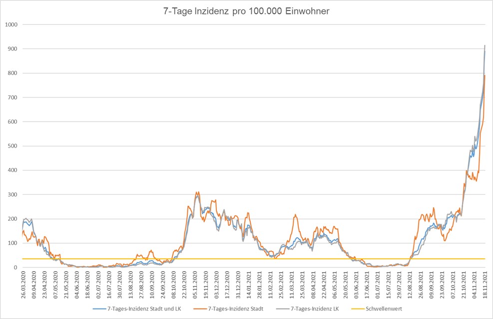 Hiervon befinden sich in Stadt und Landkreis heute 30 Corona-Patienten (am 11.11.2021: 25) mit schweren Verläufen auf einer Intensivstation.