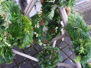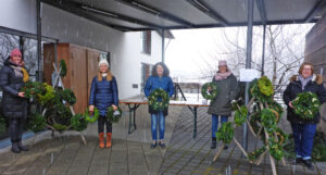 … um Tannen-, Kiefern- und viele weitere Zweige, Strohkränze und Bindematerial zur Verfügung zu stellen und um daraus rund 80 Advents- und Türkränze in ehrenamtlicher Heimarbeit zu binden. Die jüngste Helferin war 13 und die älteste 87 Jahre alt.