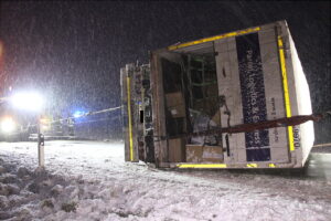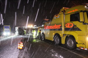 Lkw landet nachts auf schneeglatter Straße bei Albaching im Graben