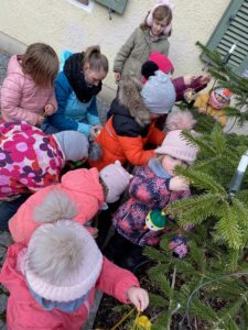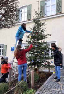Eine kleine Kinderschar unternahm mit ihren Erzieherinnen einen winterlichen Spaziergang zum Rathaus. Mit viel Freude und Begeisterung schmückten sie dort den Tannenbaum. Diesen zieren nun liebevoll gebastelte Kugeln mit Schneemännern und anderen Motiven. Auch Bürgermeisterin Sissi Schätz bewunderte die schönen Kugeln.