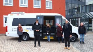 Foto (von links). Julia Hirschberger (Fachbereichsleitung Mobilität, ÖPNV und Schülerbeförderung im LRA), Landrat Max Heimerl, Melanie Schäfer (RBO), Astrid Matejka-De Jonghe (LRA), Richard Weber (Weber Reisen) und Klaus Bliemhuber (LRA) begutachteten den neuen Kleinbus der Firma Weber Reisen, der ab Januar auf der Linie 57 unterwegs ist.