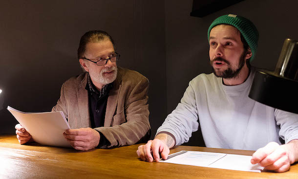 Nik Mayr liest diese Unterhaltung der beiden Schriftsteller gemeinsam mit Carsten Klemm (links).