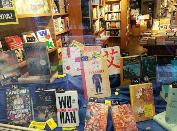 Sie zeigt zusammen mit der Wasserburger Bücherstube in der Schustergasse in Wasserburg aktuelle Informationen und Literatur zum Thema Menschenrechte und Olympia (Foto). Dort können auch Postkarten und Petitionen an der Kampagne für Hayrigul Niyaz und Zhang Zhan unterschrieben werden.