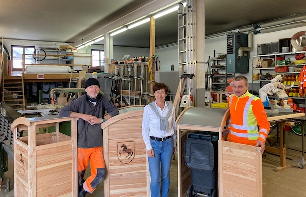 Das Lärchenholz stammt aus dem Stiftungswald. „Die leidige Frage ,wohin mit den Mülltonnen?‘ ist nun gelöst“, freut sich Bürgermeisterin Sissi Schätz.