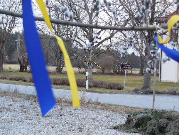 Um der Ordensschwester ihre Solidarität mit der Ukraine zu bekunden, haben sich Nachbarn aus Stadl spontan zusammengeschlossen und ihr Mitgefühl bekundet. An Gartenzäunen und Häusern hängen blau-gelbe Fähnchen.