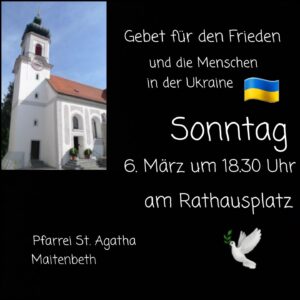 Die Pfarrei Maitenbeth lädt alle zu einem Gebet für den Frieden und für die Menschen in der Ukraine ein. Das Friedensgebet findet am kommenden Sonntag, 6. März, um 18.30 Uhr am Rathausplatz in Maitenbeth statt.