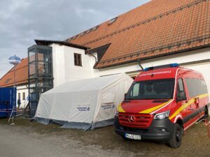Nach Ankunft in einem beheizten Wartezonen-Zelt wurden die vier Frauen, die über private Kontakte in den Landkreis gekommen sind, von Einsatzkräften der Schnelleinsatzgruppe des Bayerischen Roten Kreuzes (BRK) mit Lebensmitteln und Hygieneartikeln versorgt. Darüber hinaus unterzogen sie sich einem Corona-Test.
