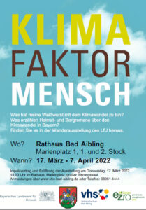 Die Wanderausstellung ‚Klima Faktor Mensch‘ des Landesamtes für Umwelt ist ab der nächsten Woche – vom Donnerstag, 17. März, bis zum 8. April im Rathaus in Bad Aibling zu sehen. Im wahrsten Sinne des Wortes ‚einprägsam‘ informiert die Ausstellung über die Themen Klimaschutz und Nachhaltigkeit.