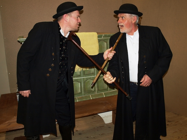Foto: Bei der „Brautschau“ geraten Schmuser Elfinger (Leonhard Fischbacher, links) und Viehhändler Palser (Rupert Huber) aneinander. / Foto: Theatergemeinschaft Amerang