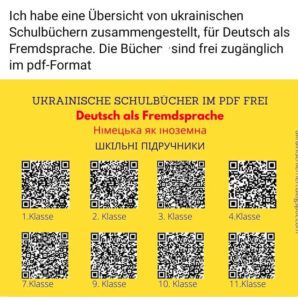 Das meldet am heutigen Samstag Uwe Schröder, Dipl. Theologe und Notfallseelsorger von der Wasserburger Pfarrei St. Jakob, unserer Redaktion: Von einem guten Freund bei Vatican News/Deutsche Sektion – Mario Galgano, selbst mit einer Ukrainerin verheiratet – seien diese QR-Codes jetzt zusammengestellt und zur Verfügung gestellt worden. Ukrainische Schulbücher im PDF-Format und frei zugänglich über die Codes für Deutsch als Fremdsprache.