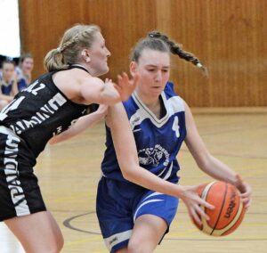 Foto: Judith Denner (blaues Dress) setzt sich auf dem Weg zum Korb gegen eine ihrer Gegenspielerinnen vom SV Bad Tölz durch.