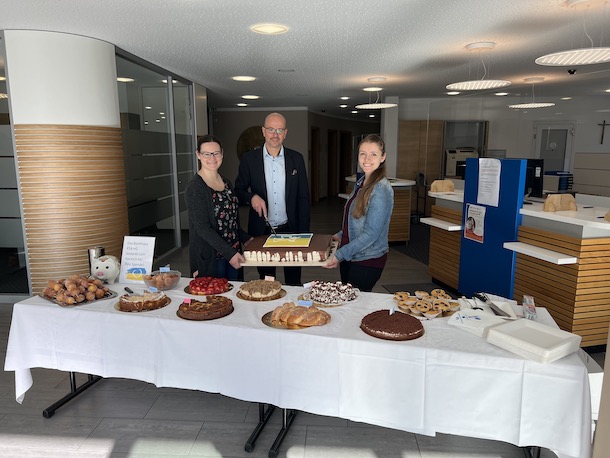 Die Resonanz bei den Kolleginnen und Kollegen war so positiv, dass in kürzester Zeit 90 Kuchen in bunter Kreativität zum Verkauf angeboten werden konnten. Die Backkünste reichten von der blau-gelben Ukraine-Torte über Schwarzwälder-Kirsch bis hin zu originellen Muffins.