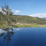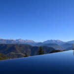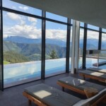 Am höchsten Punkt des im Wald versteckten Mountain-Hideaways trohnt dessen Sky-Spa im Glaskubus. Der 17 Meter lange Infinity-Sky-Pool diktierte schon bei der Planung die Ausrichtung des Hotels, um die Dolomitenkette von Sellastock bis zum Latemar parallel zu begleiten. Liegebereiche im Innen- und Außenbereich und ein vollverglastes Hallenbad komplettieren das Sky-Spa.