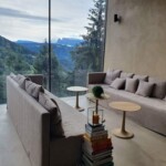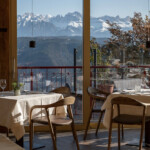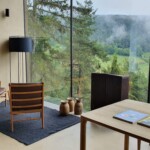 Vollverglaste Fassadenfronten brechen durch die unscheinbare Lärchenfassade und präsentieren einen 180-Grad-Panoramablick auf das UNESCO-Weltnaturerbe der Dolomiten. Verschiedene Plattformen unterschiedlicher Ebenen überraschen mit immer neuen Blickwinkeln auf die alpine Naturlandschaft zwischen Berg und Wald. Der cleane Chic der Empfangshalle präsentiert sich minimalistisch mit gespachtelten Lehm- und Kalkböden sowie einer riesigen Nussholzbar. Individuelle Akzente setzt das Sammelsurium an italienischer und skandinavischer Designermöbel von Cassina, Carl Hansen und vielen mehr.