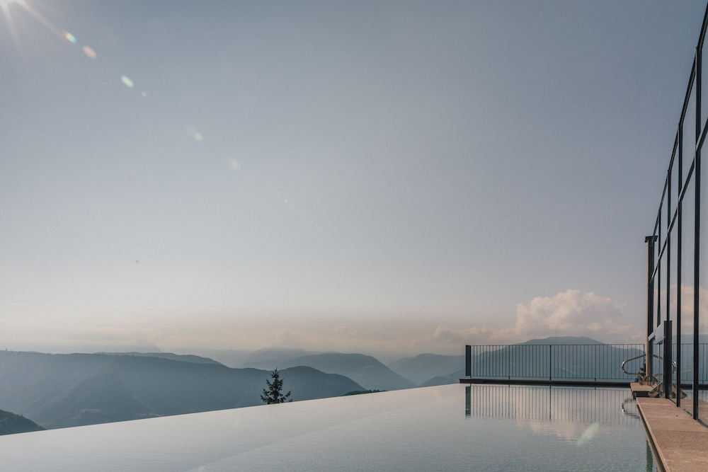 Am höchsten Punkt des im Wald versteckten Mountain-Hideaways trohnt dessen Sky-Spa im Glaskubus. Der 17 Meter lange Infinity-Sky-Pool diktierte schon bei der Planung die Ausrichtung des Hotels, um die Dolomitenkette von Sellastock bis zum Latemar parallel zu begleiten. Liegebereiche im Innen- und Außenbereich und ein vollverglastes Hallenbad komplettieren das Sky-Spa.