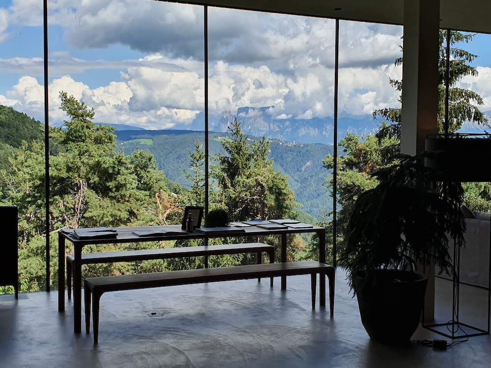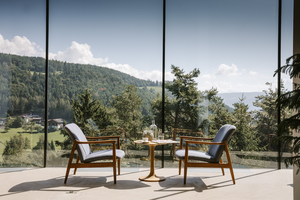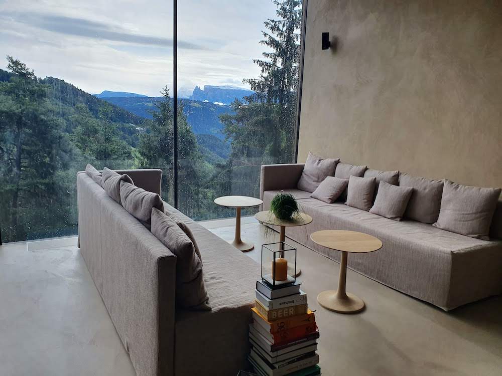 Vollverglaste Fassadenfronten brechen durch die unscheinbare Lärchenfassade und präsentieren einen 180-Grad-Panoramablick auf das UNESCO-Weltnaturerbe der Dolomiten. Verschiedene Plattformen unterschiedlicher Ebenen überraschen mit immer neuen Blickwinkeln auf die alpine Naturlandschaft zwischen Berg und Wald. Der cleane Chic der Empfangshalle präsentiert sich minimalistisch mit gespachtelten Lehm- und Kalkböden sowie einer riesigen Nussholzbar. Individuelle Akzente setzt das Sammelsurium an italienischer und skandinavischer Designermöbel von Cassina, Carl Hansen und vielen mehr.