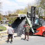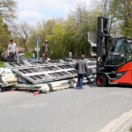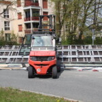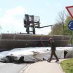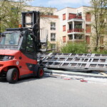 Für den Abtransport der verlorenen Ladung wurde ein großer Stapler angefordert. Die Bergung der Ladung wird einige Zeit in Anspruch nehmen.