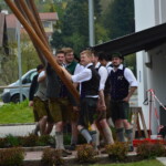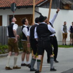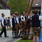 Ab 13 Uhr folgte dann das Aufstellen. Unter der fachkundigen Leitung von Zimmerermeister Rudi Schiller ging es Meter um Meter nach oben. Hoch gestemmt wurde der Baum traditionell mit „Schweiberln“. Diese Aufgabe übernahmen die starken Männer der Maibaumfreunde Soyen und Kirchreith, unterstützt von den Rechtmehringer Dieben.